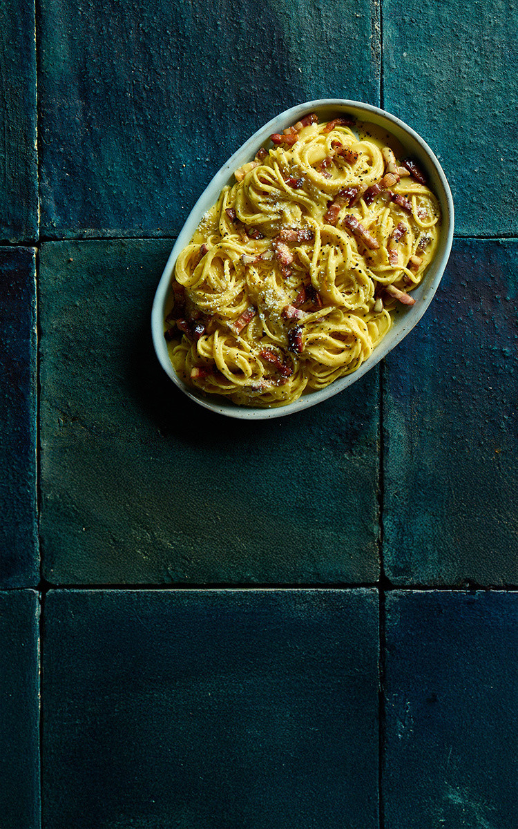 Fresh egg spaghetti in a creamy carbonara sauce with pieces of smoked bacon in a Parmigiano Reggiano cheese garnish.