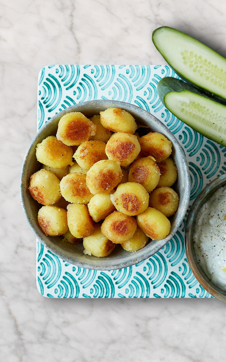 Serve the Filled Pan-Fry Gnocchi with the bowl of tzatziki dip.
