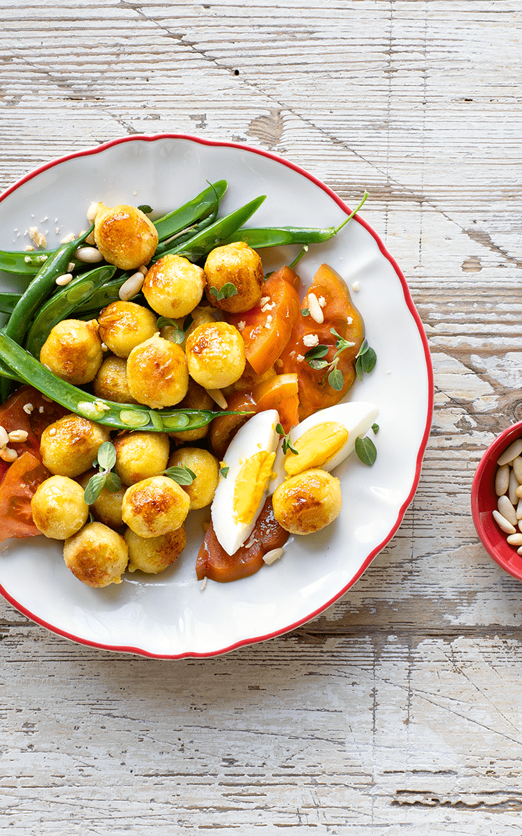 Place a handful of green beans, a sliced tomato and half egg on each plate. Season with olive oil, the sprig of oregano, salt and pepper then add the gnocchi.